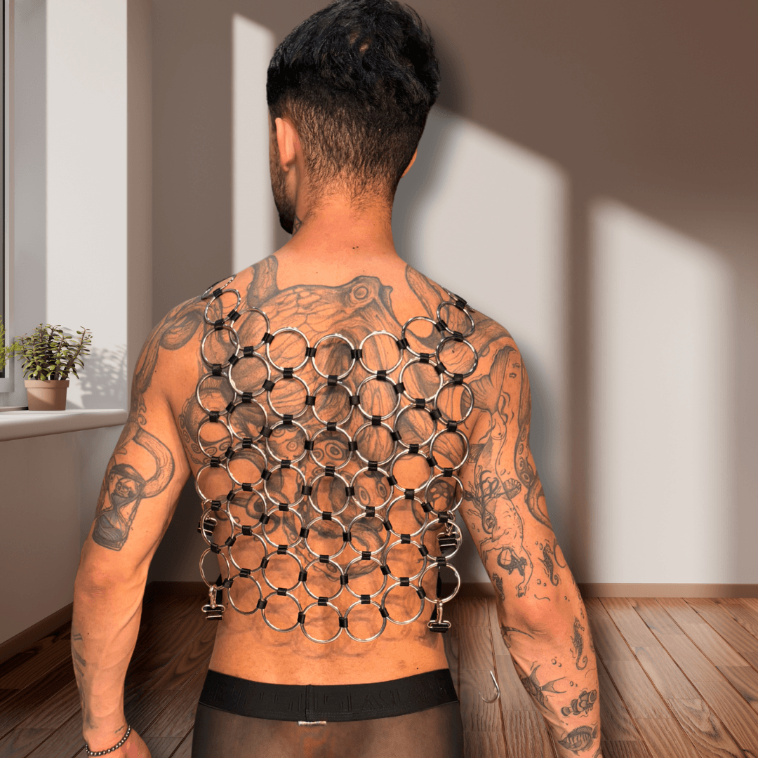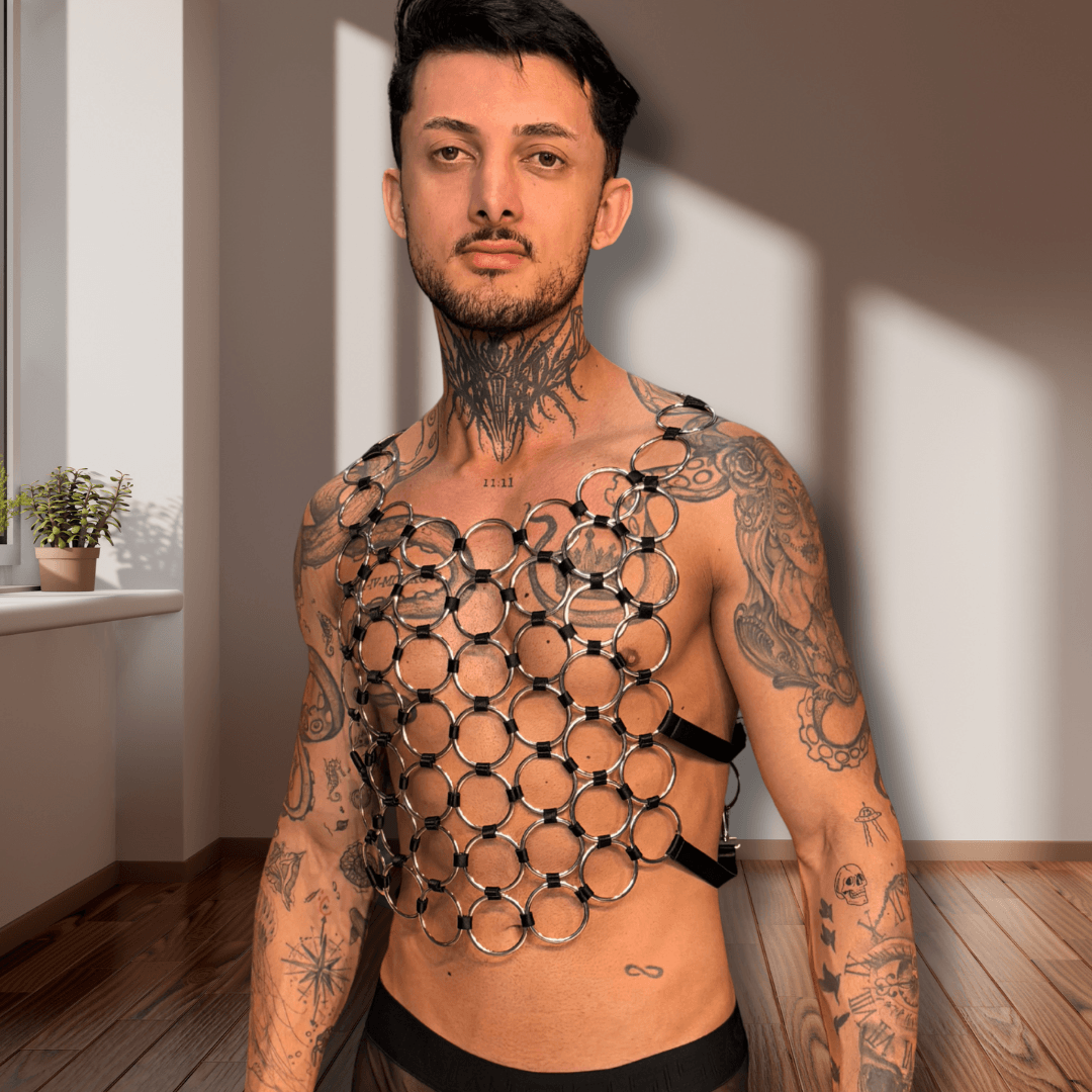 Cada argola carrega peso, presença e intenção. O metal não enferruja, não cede, não pede licença. Assim como quem veste. O design envolve o corpo com precisão, criando uma armadura sensual que valoriza o torso e revela exatamente o que deve ser visto.