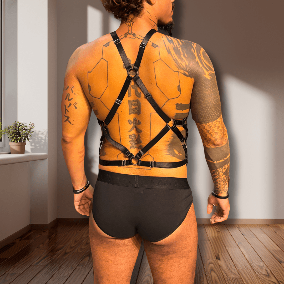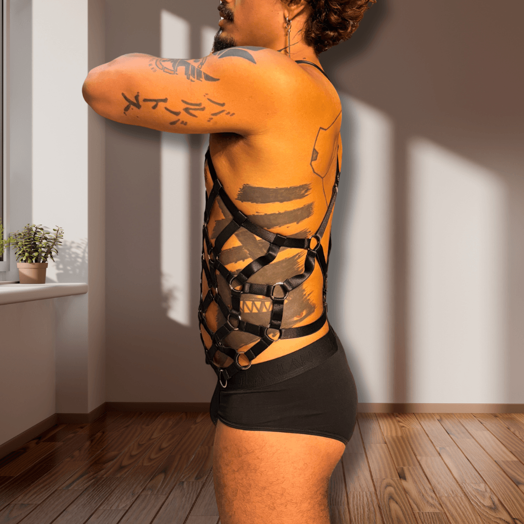 Seu desenho geométrico envolve o torso com precisão, criando linhas que valorizam o peitoral e definem a silhueta com uma elegância intensa e provocante. Produzida em elástico premium, a peça oferece firmeza e conforto ao mesmo tempo, acompanhando os movimentos do corpo com naturalidade.